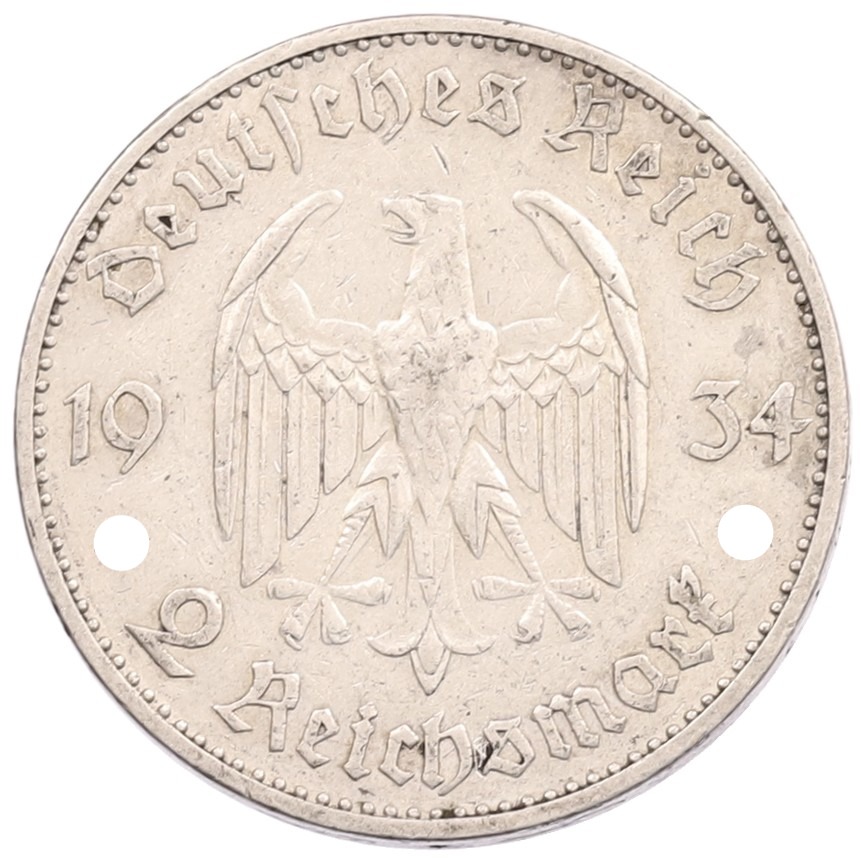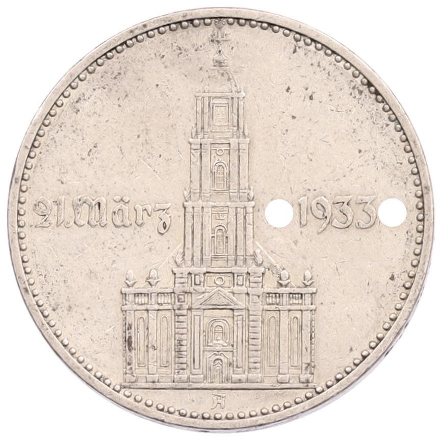 2 рейхсмарки 1934 года А Германия «Годовщина нацистского режима — Гарнизонная церковь в Постдаме» (Кирха подписная)