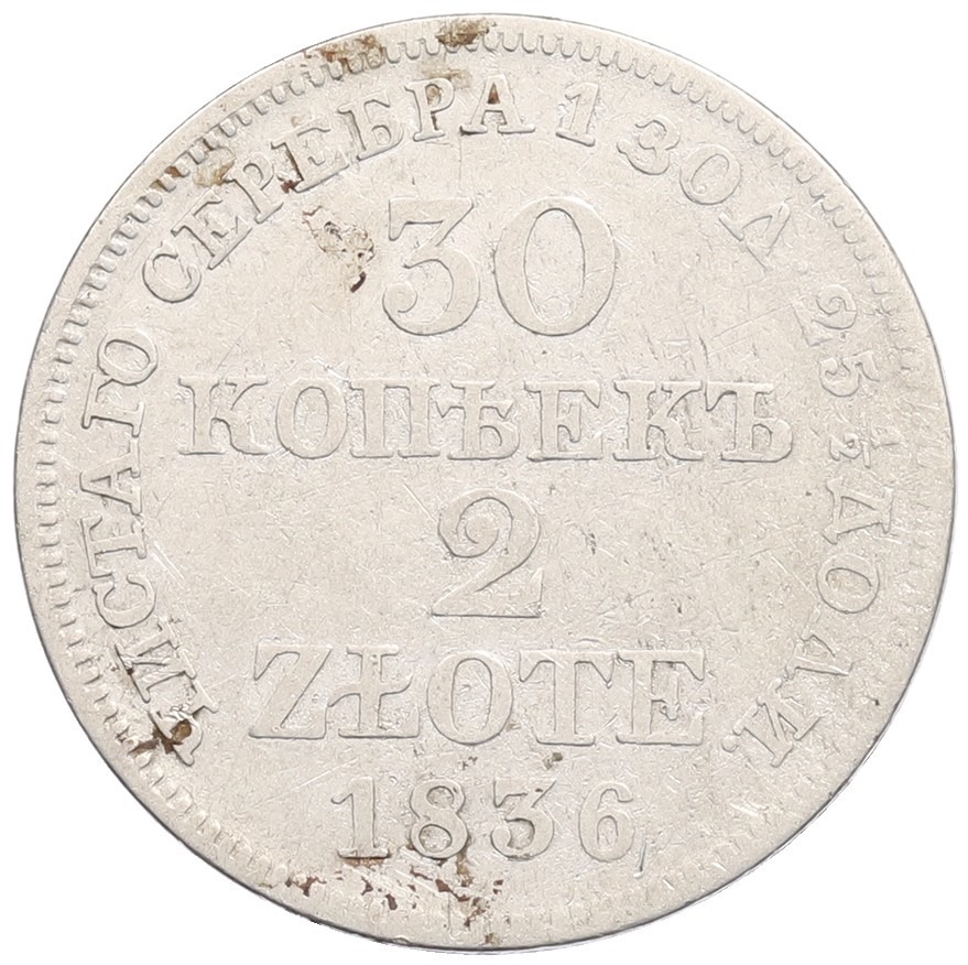 30 копеек 2 злотых 1836 года MW Для Польши
