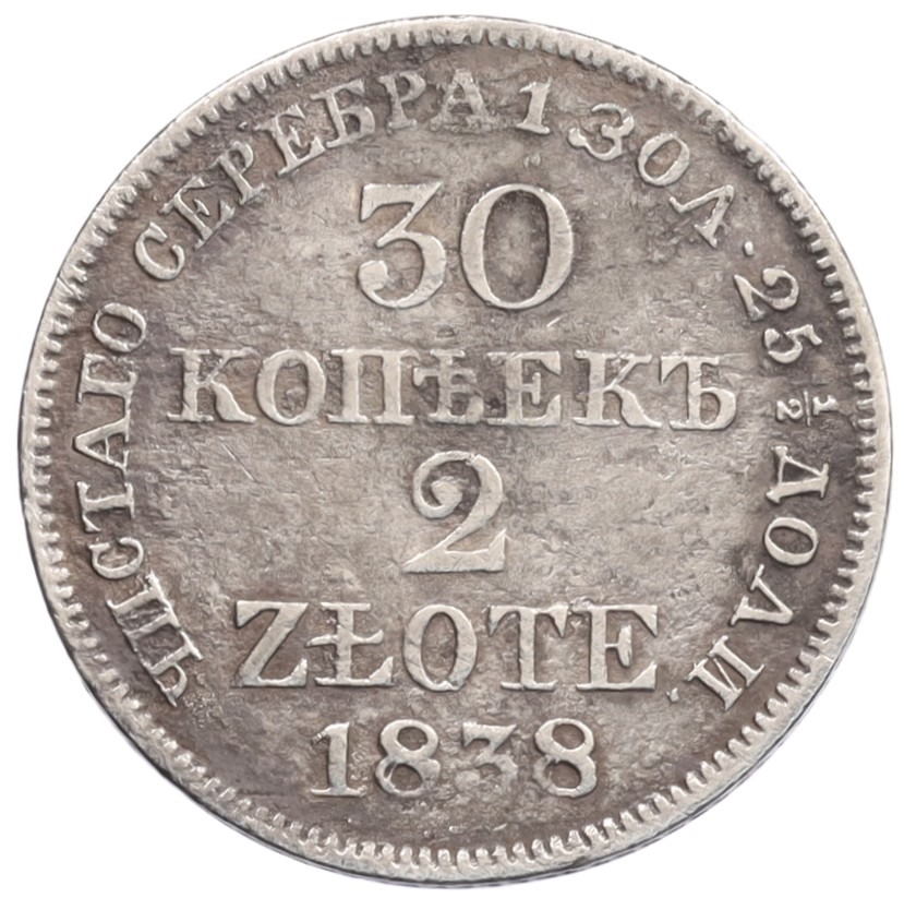 30 копеек 2 злотых 1838 года MW