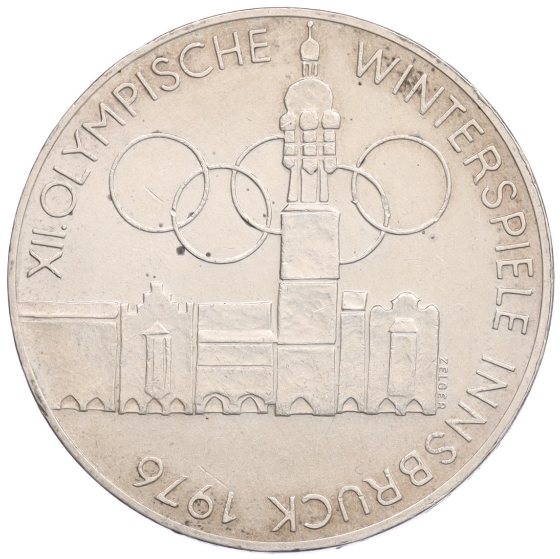 100 шиллингов 1975 года Австрия "XII зимние Олимпийские Игры в Инсбруке 1976 года - Здания и Олимпийская эмблема"