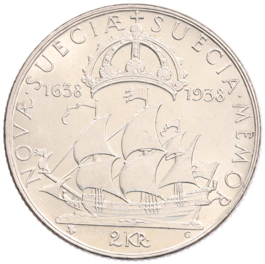 2 кроны 1938 года Швеция «300 лет поселению Делавэр»