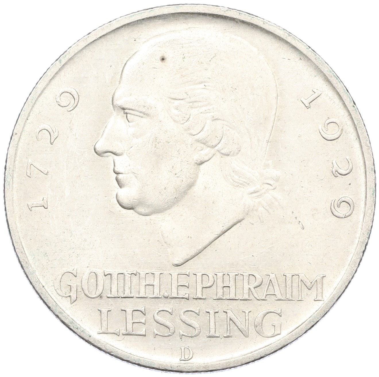 5 рейхсмарок 1929 года D Германия «200 лет со дня рождения Готхольда Лессинга»