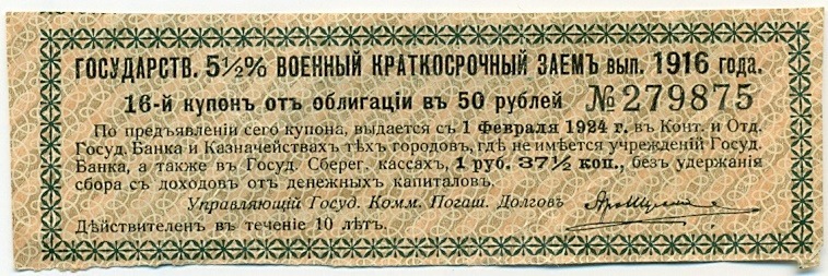 Купон от облигации 50 рублей 1916 года «Государственный военный краткосрочный заем»