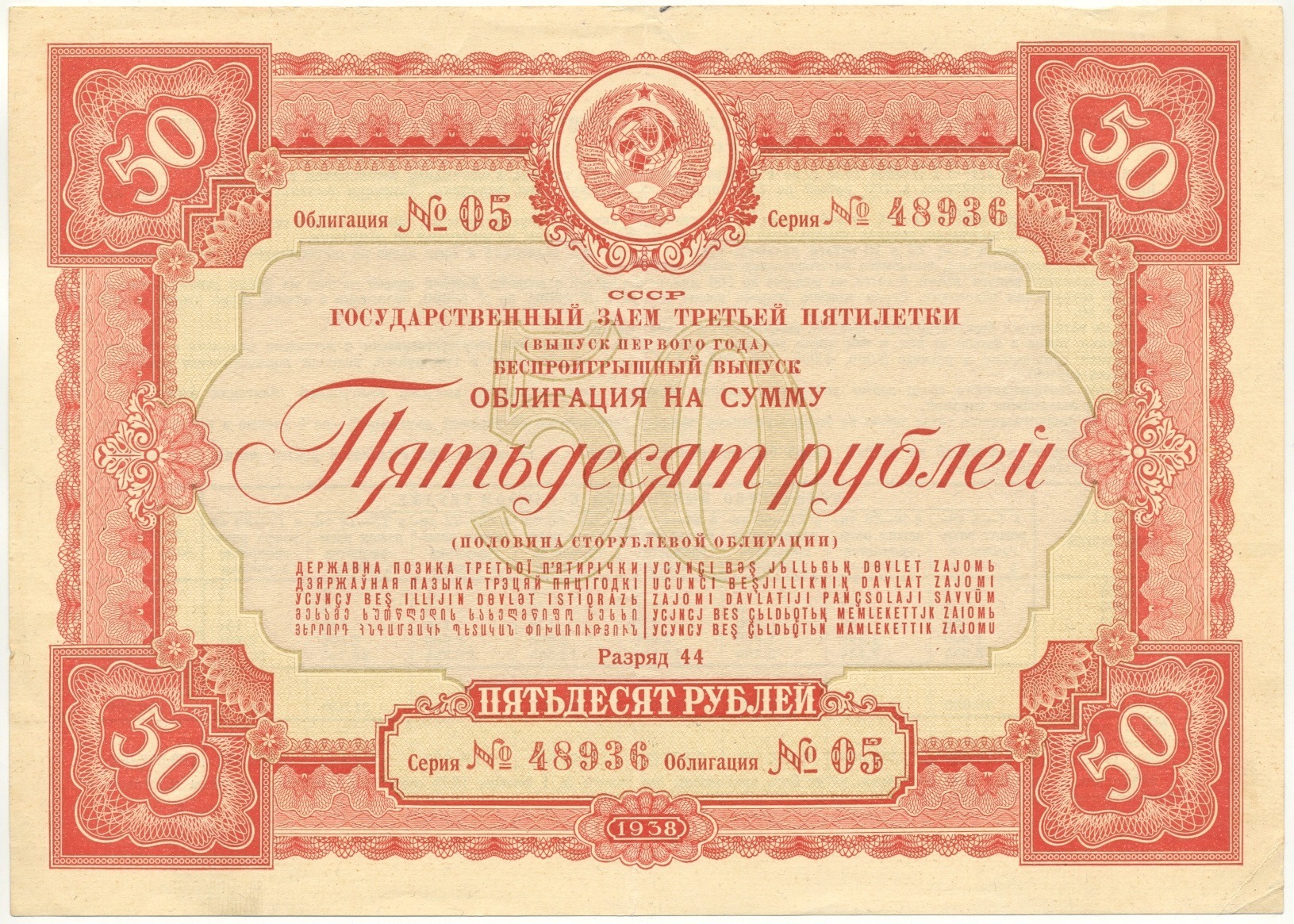 Облигация в 50 рублей 1938 года Государственный заем Третьей пятилетки (Выпуск 1-го года)