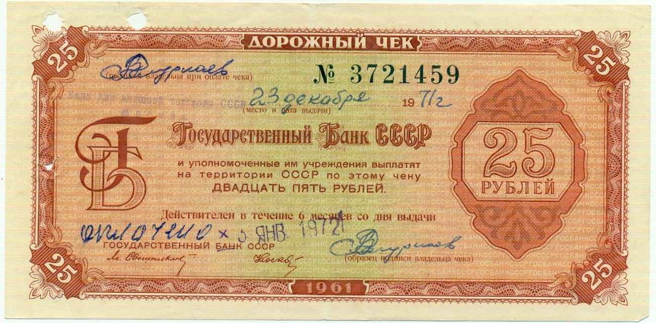 25 рублей 1972 года Дорожный чек Банка для внешней торговли СССР (Погашенный)