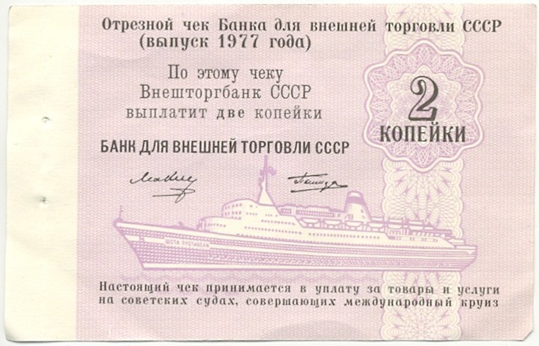 2 копейки 1977 года Круизный отрезной чек Банка для внешней торговли СССР (Без номера)