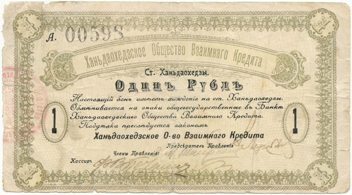 1 рубль 1919 года Ханьдаохедзкое Общество Взаимного Кредита (Полоса отчуждения КВЖД)