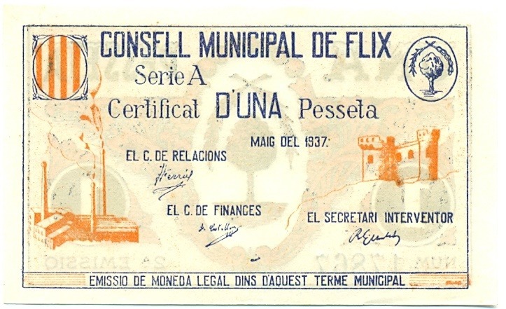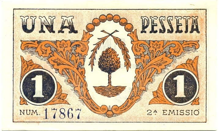 1 песета 1937 года Виланова-и-ла-Желтру (Гражданская Война в Испании)