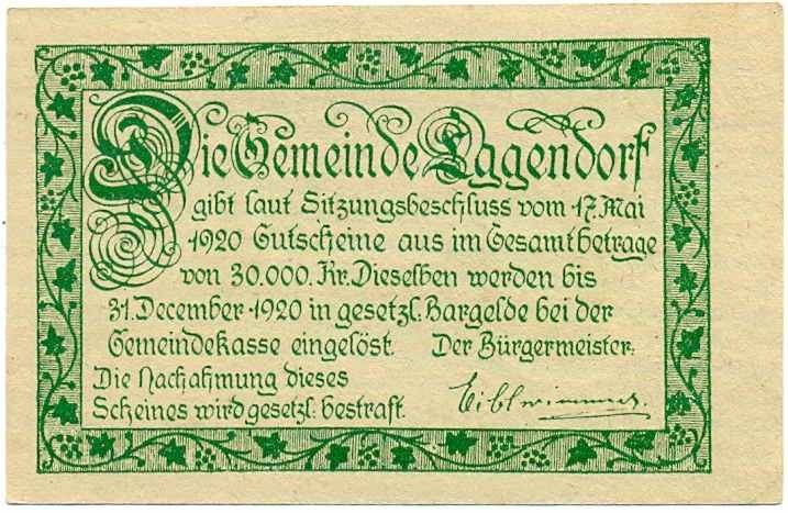 20 геллеров 1920 года Австрия — Коммуна Эггендорф (Нотгельд)