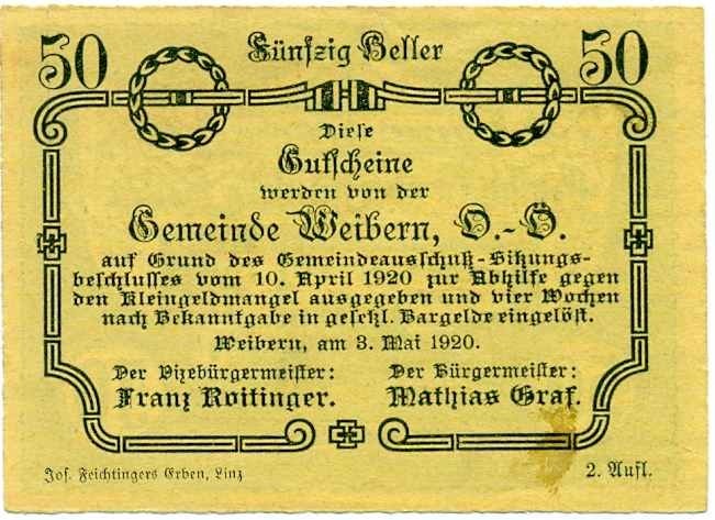 50 геллеров 1920 года Австрия — Коммуна Вайберн (Нотгельд)