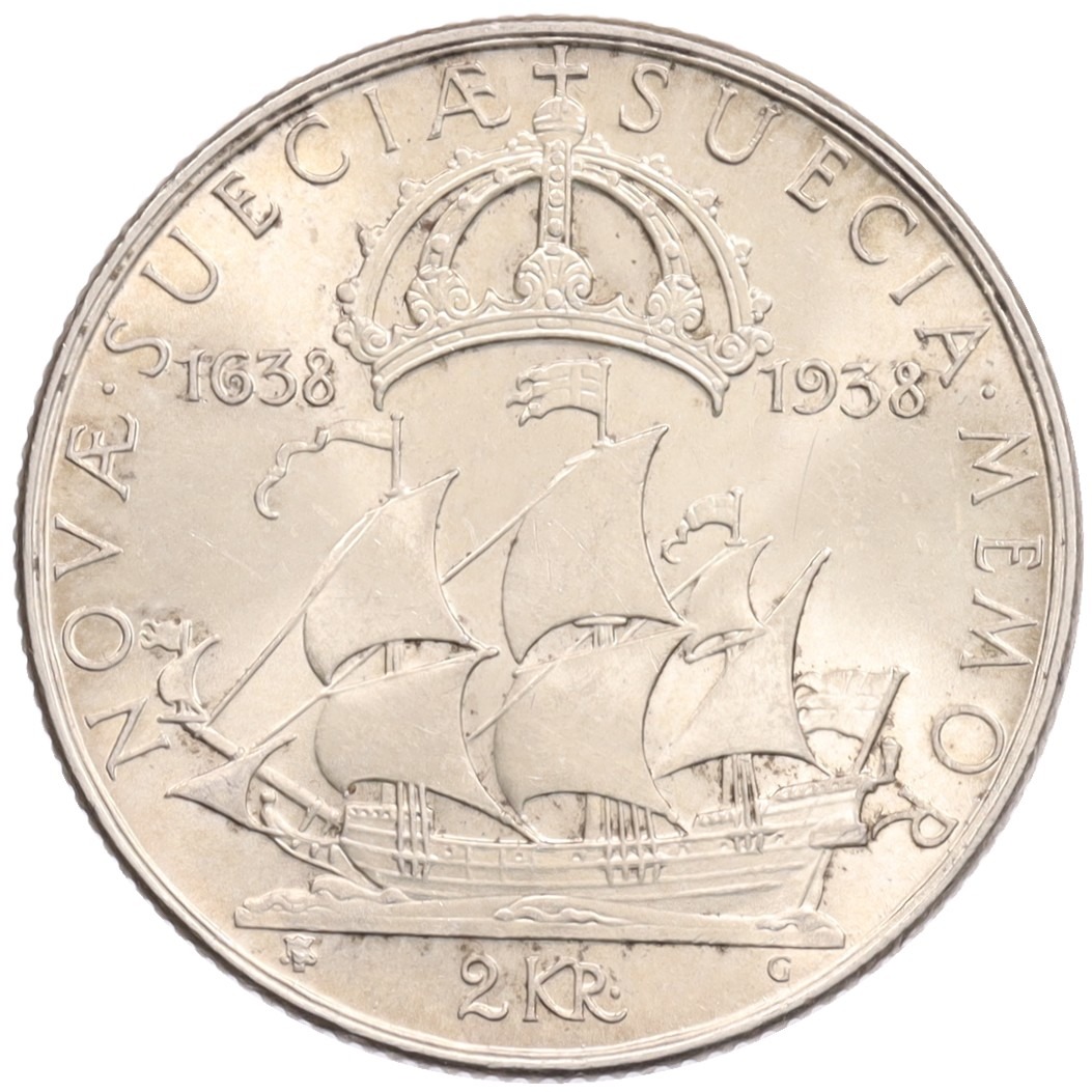 2 кроны 1938 года Швеция «300 лет поселению Делавэр»