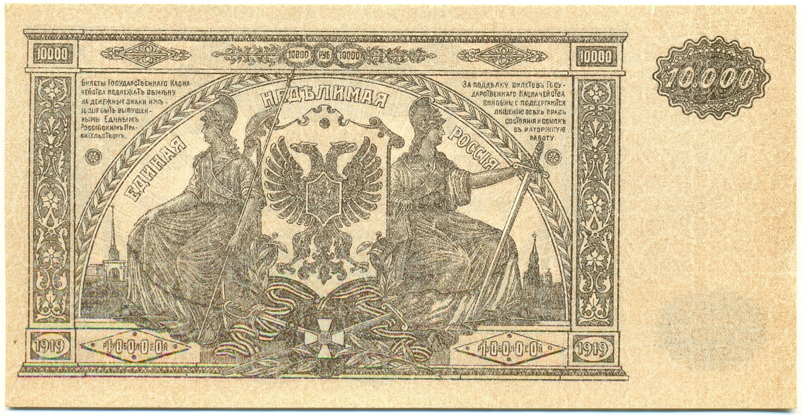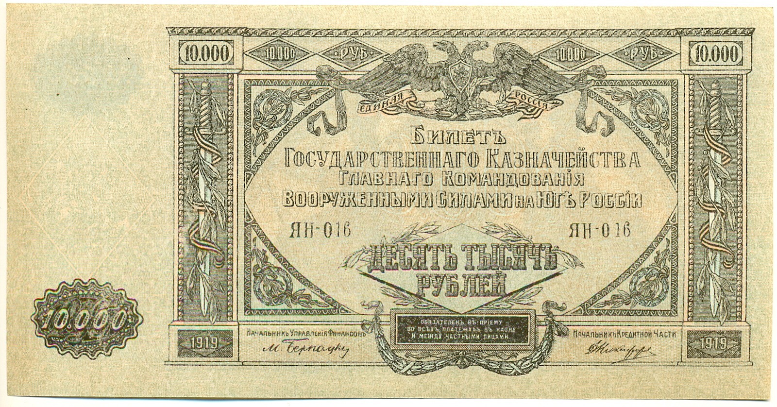 10000 рублей 1919 года Главное командование Вооруженными силами на Юге России