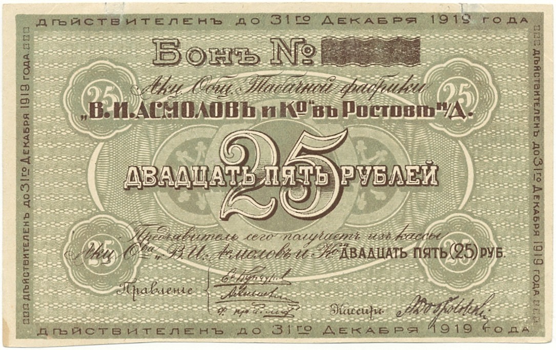 25 рублей 1919 года Акционерное общество табачной фабрики Асмолов (Ростов-на-Дону)