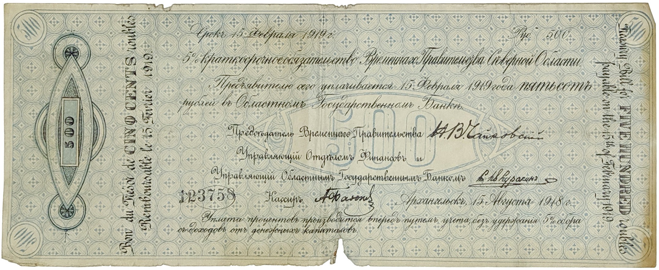 500 рублей 1918 года 5% краткосрочное обязательство Временного Правительства Северной области (Архангельск)