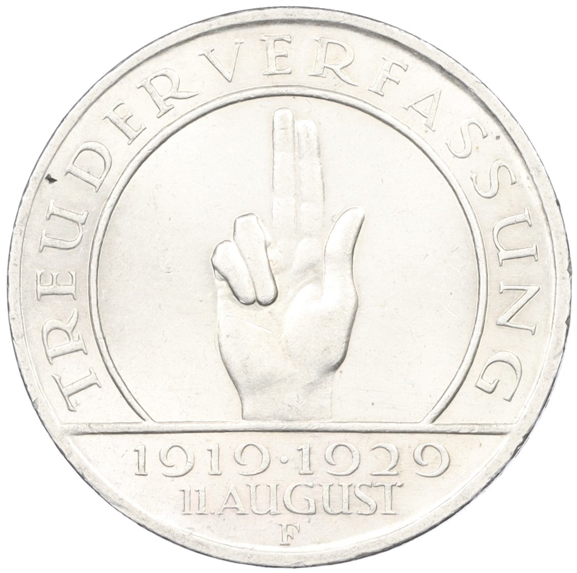 3 рейхсмарки 1929 года F Германия «10 лет Веймарской конституции»