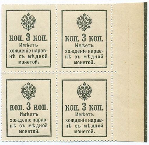 3 копейки 1915 года (Марки-деньги) — часть листа из 4 шт (квартброк)
