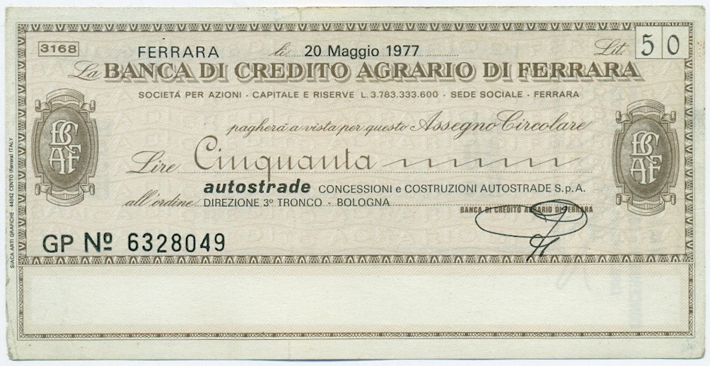 Банковский чек 50 лир 1977 года Италия Unione Provinciale Agricoltori Di Ferrara