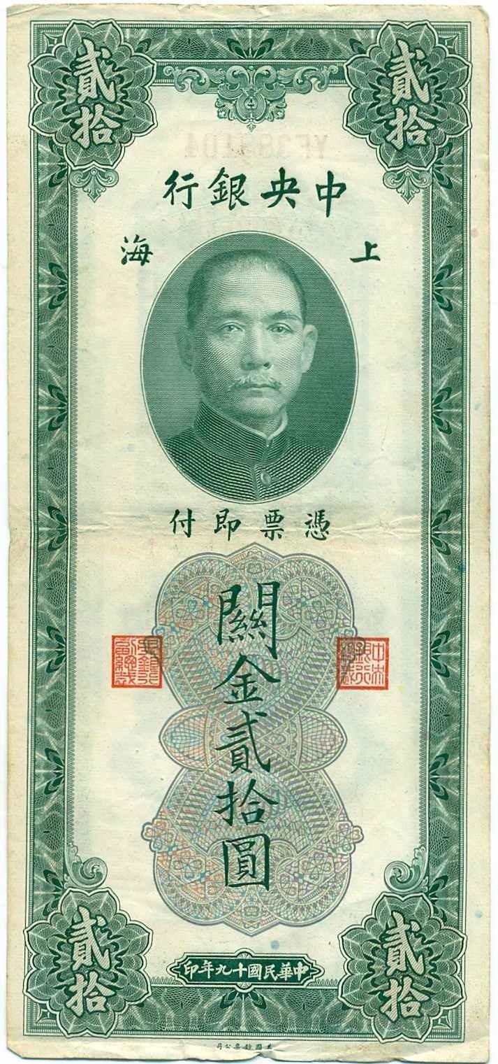 20 таможенных золотых единиц 1930 года Китай