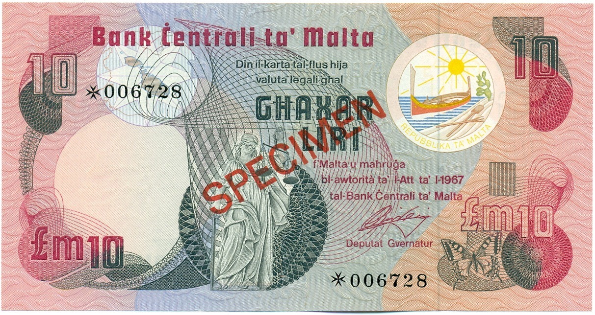 10 фунтов (лир) 1967 года Мальта (ОБРАЗЕЦ)