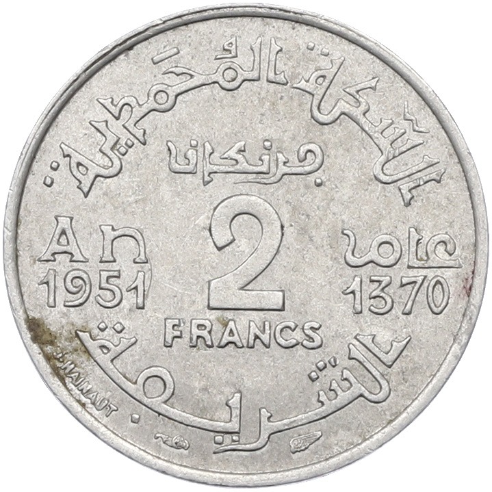 2 франка 1951 года (AH 1370) Марокко (Французский протекторат)