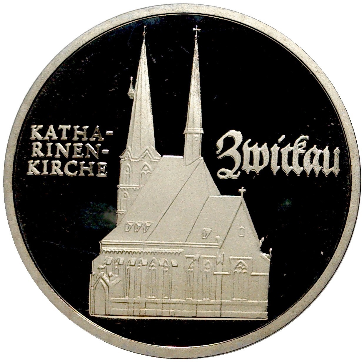 5 марок 1989 года Восточная Германия (ГДР) «500 лет со дня рождения Томаса Мюнцера — Церковь Святой Екатерины в Цвиккау» (Proof)