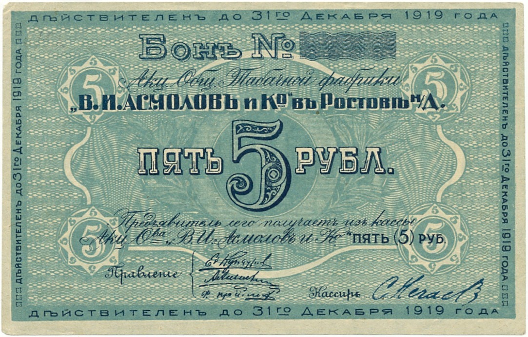5 рублей 1919 года Акционерное общество табачной фабрики Асмолов (Ростов-на-Дону)