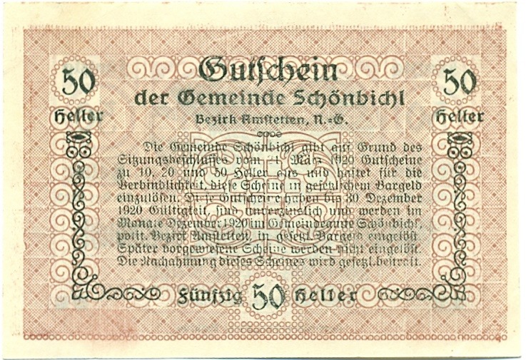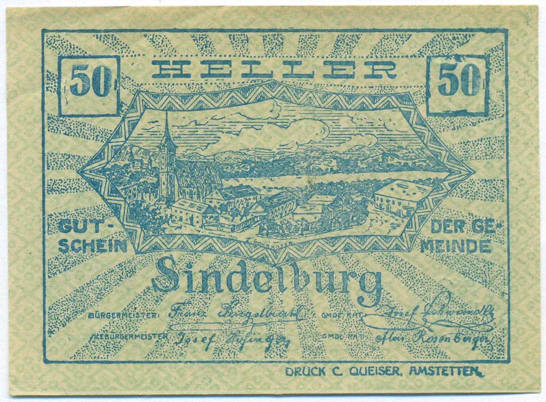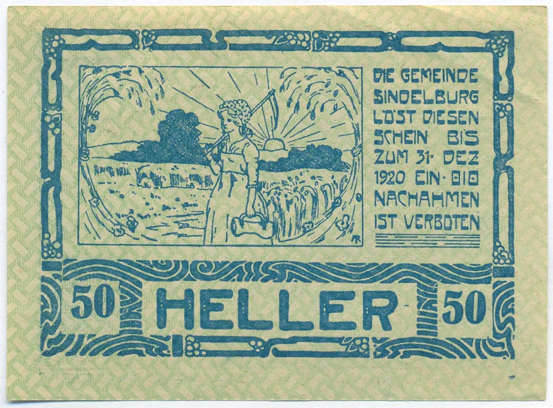 50 геллеров 1920 года Австрия — община Зиндельбург (Нотгельд)