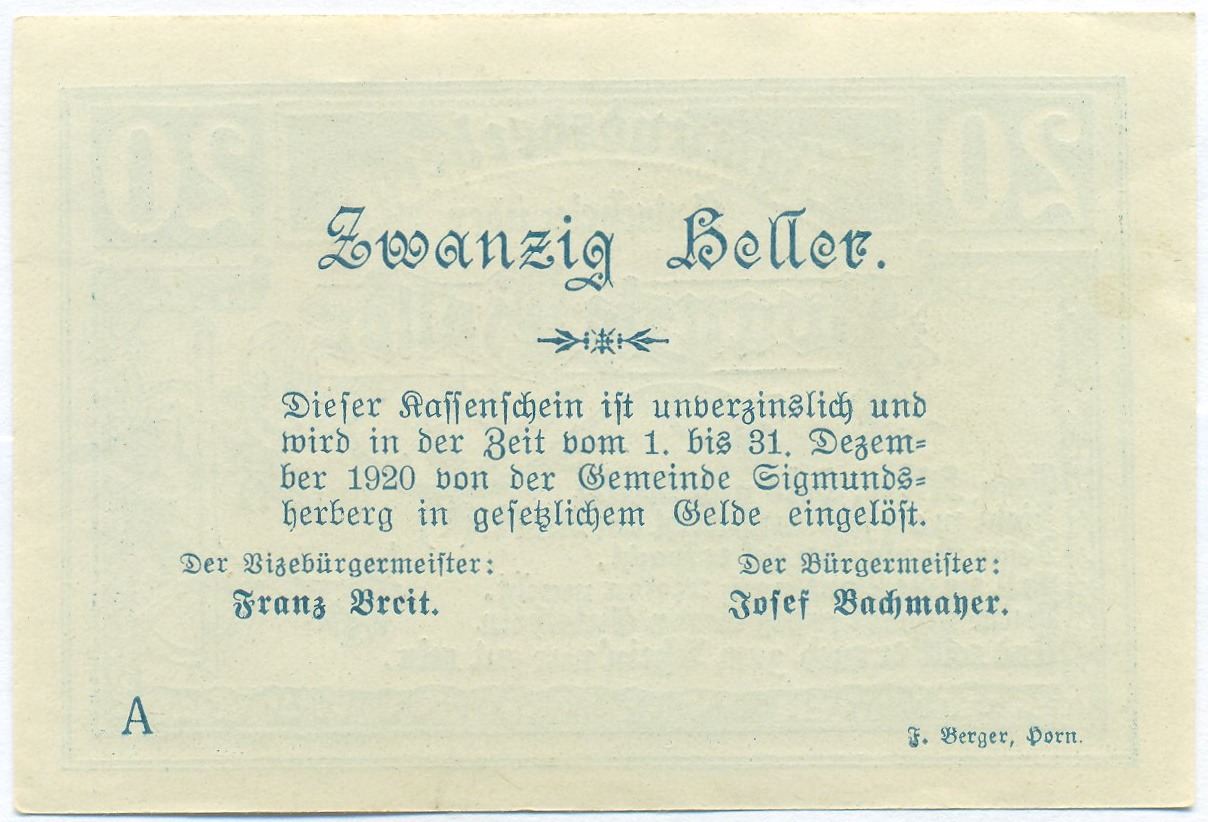 20 геллеров 1920 года Австрия — Зигмундсхерберг (Нотгельд)