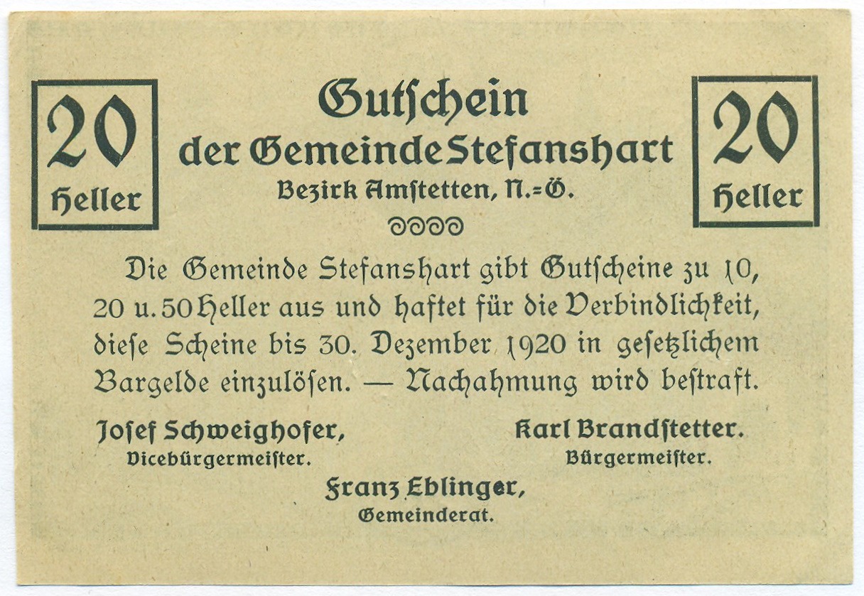 20 геллеров 1920 года Австрия — община Штефансхарт (Нотгельд)