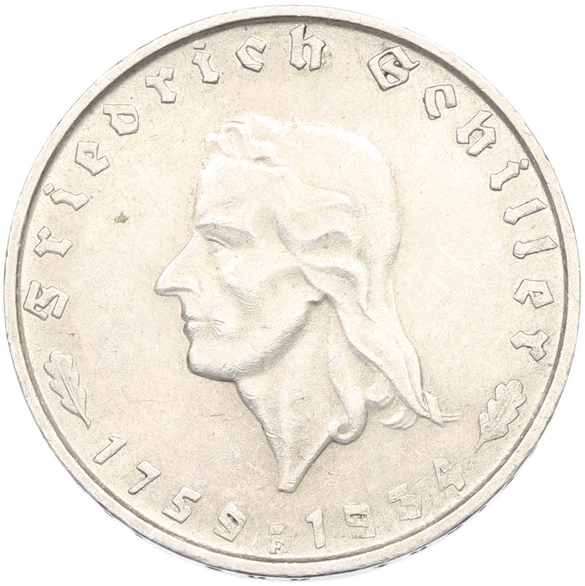 2 рейхсмарки 1934 года F Германия «175 лет со дня рождения Фридриха Шиллера»