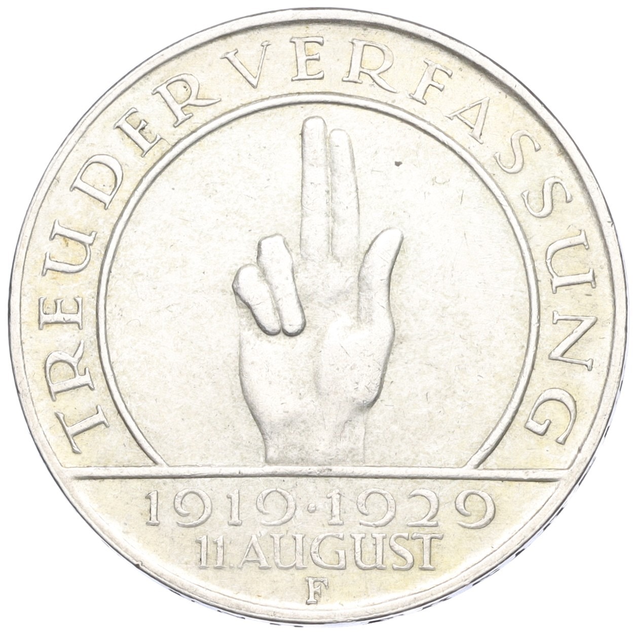 3 рейхсмарки 1929 года F Германия «10 лет Веймарской конституции»