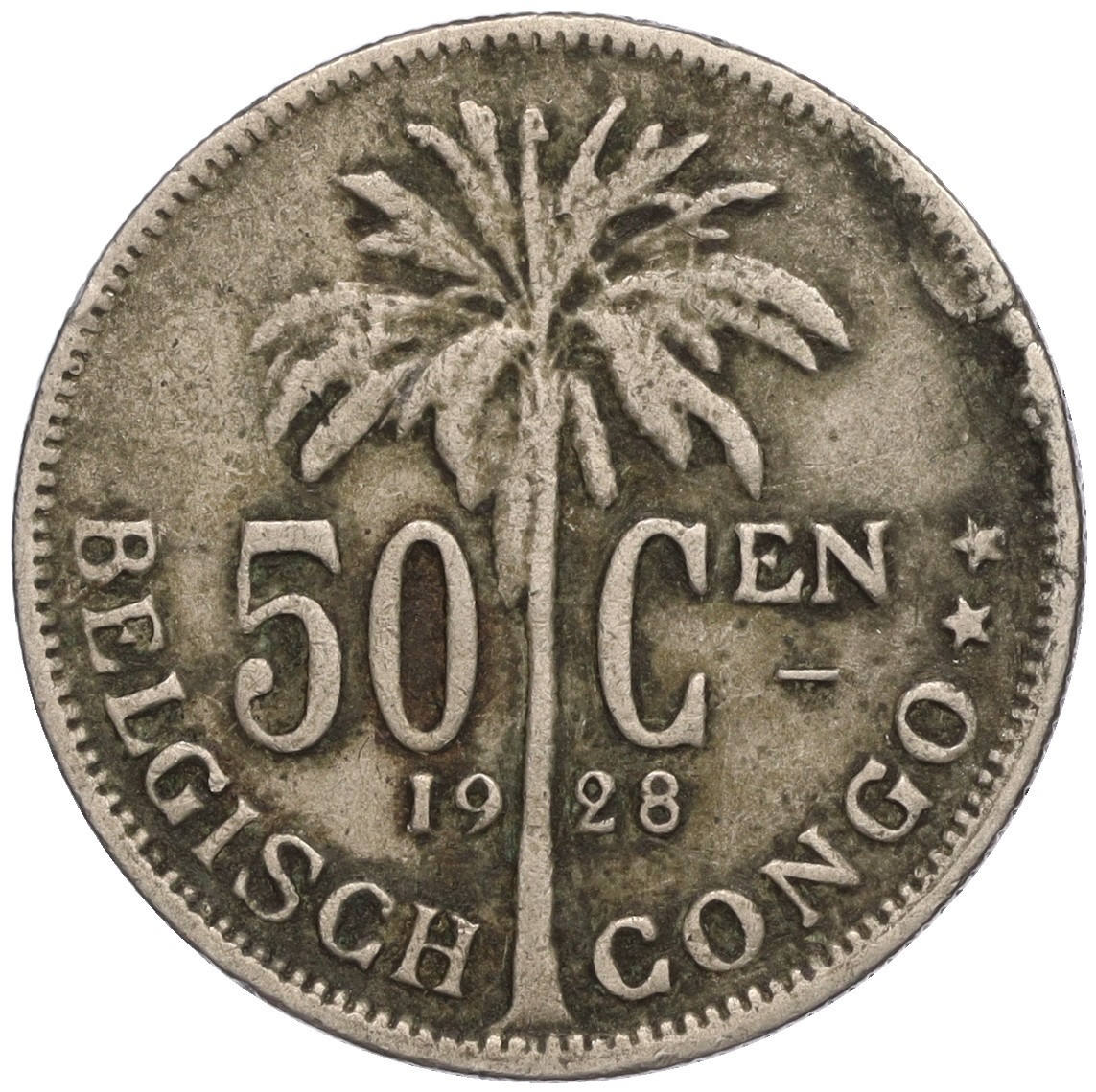 50 сантимов 1928 года Бельгийское Конго — легенда на фламандском (BELGISH CONGO / DER BELGEN)