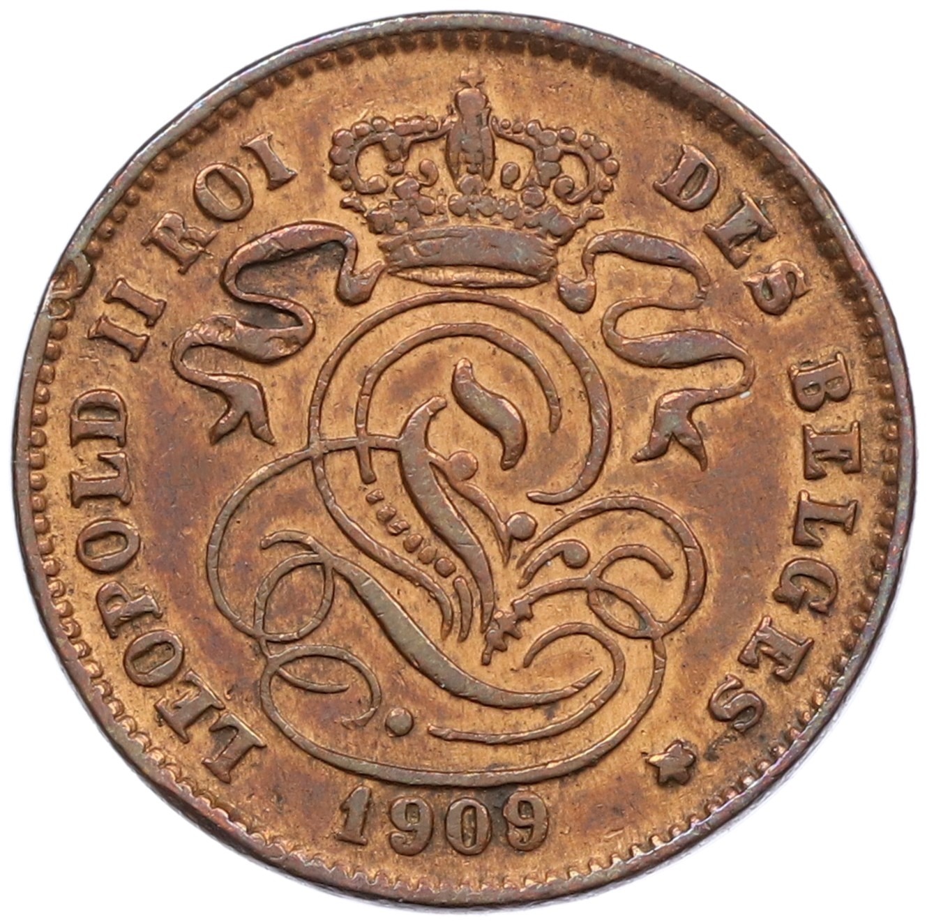 2 сантима 1909 года Бельгия — надпись на французском (DES BELGES)