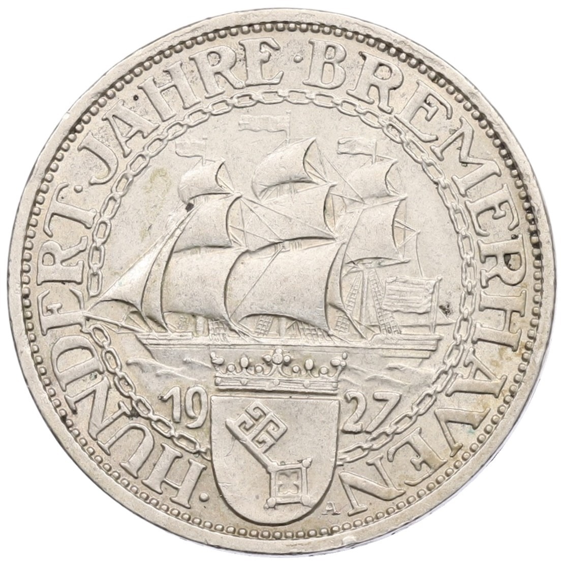 3 рейхсмарки 1927 года A Германия «100 лет Бремерхафену»