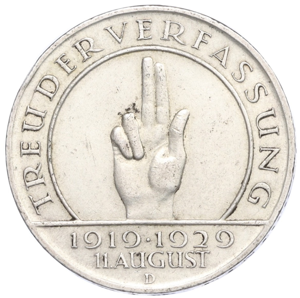 3 рейхсмарки 1929 года D Германия «10 лет Веймарской конституции»