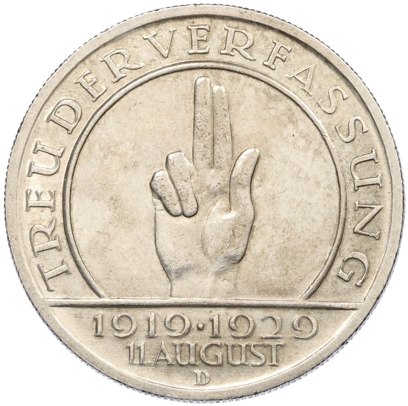 5 рейхсмарок 1929 года D Германия «10 лет Веймарской конституции»